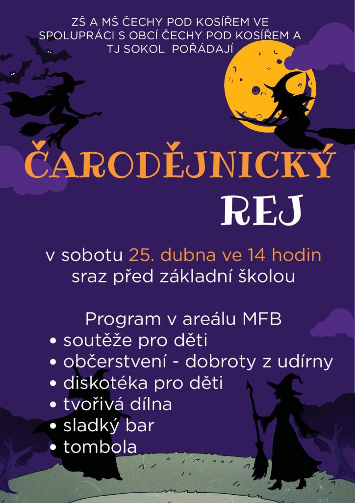 Základní škola a mateřská škola Čechy pod Kosířem ve spolupráci s obcí Čechy pod Kosířem a TJ Sokol srdečně zvou na ČARODĚJNICKÝ REJ, který se uskuteční v sobotu 25. dubna 2026. Sraz čarodějnic je ve 14.00 hod. před základní školou.
