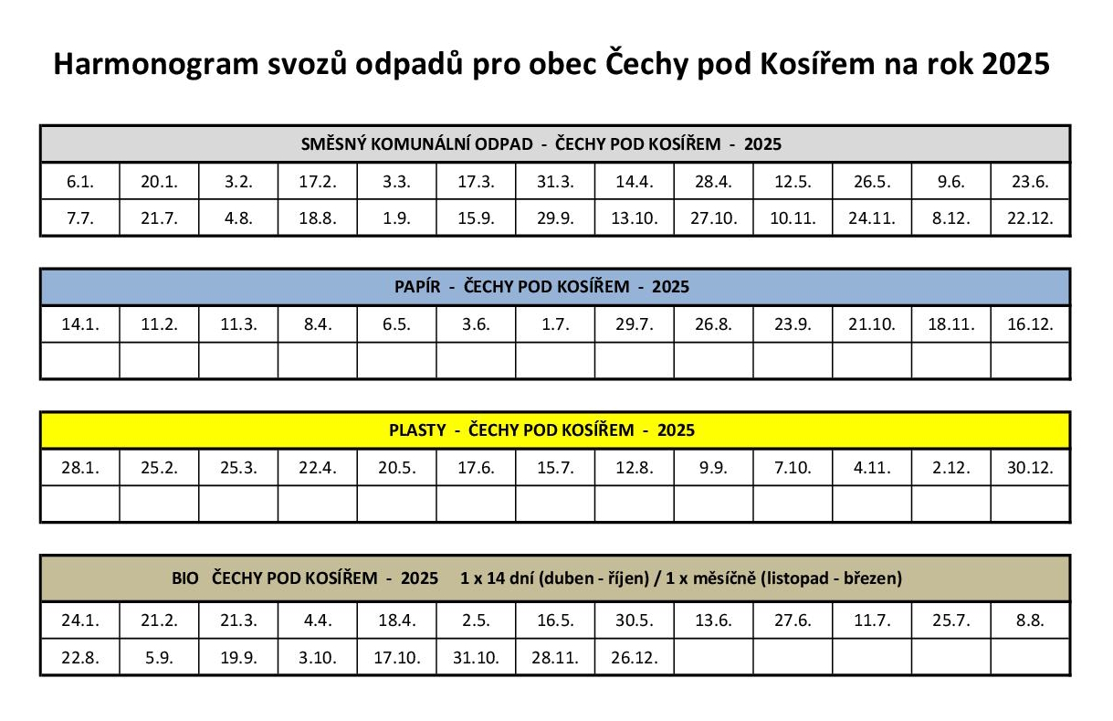 Aktuální harmonogram svozů dle druhu odpadu v roce 2025 v Čechách pod Kosířem, který zajišťuje svozová firma FCC Prostějov.