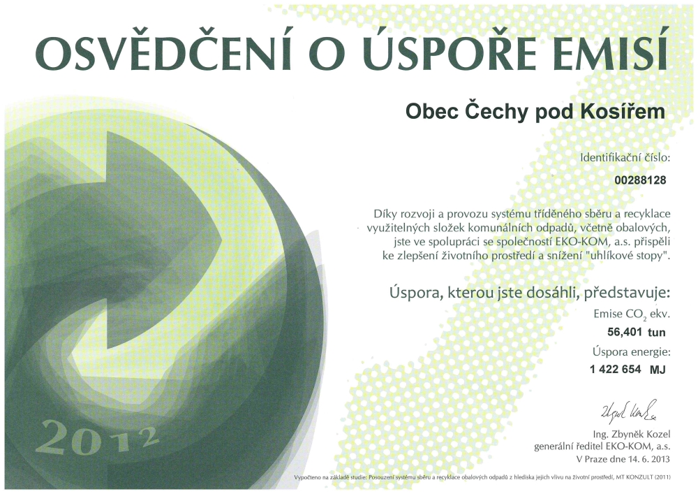 Díky rozvoji a provozu systému tříděného sběru a recyklace využitelných složek komunálních odpadů, včetně obalových jsme ve spolupráci se společností EKO-KOM, a. s. přispěli ke zlepšení životního prostředí a snížení "uhlíkové stopy".
