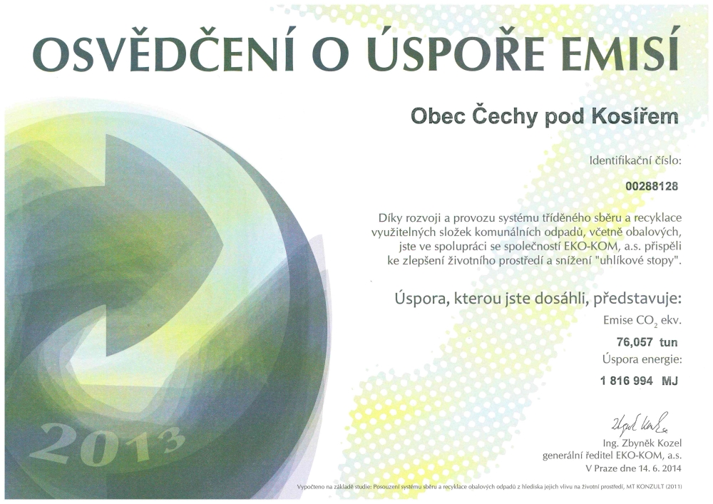Na osvědčeních jsou uvedeny výsledky za roky 2014 až 2010, kterých jsme dosáhli v naší obci a tím přispěli ke zlepšní životního prostředí a snížení uhlíkové stopy.