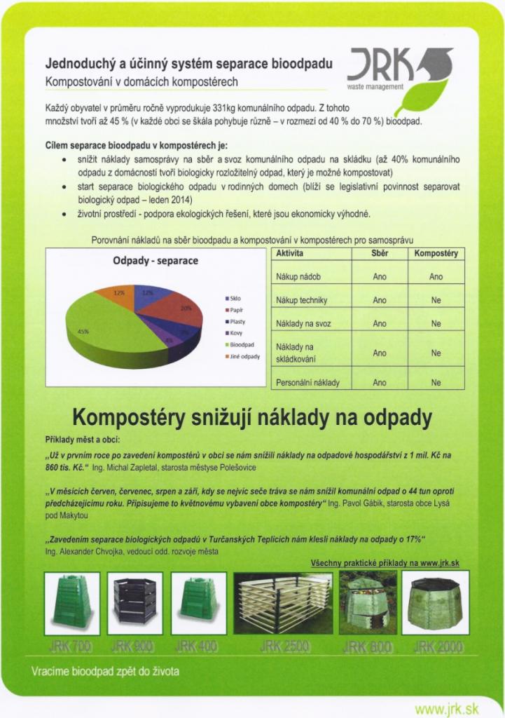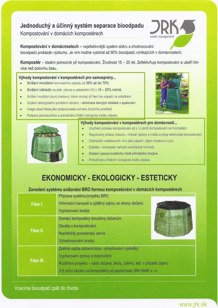 Současně se zpravodajem bude do každé domácnosti doručen anketní lístek. Potřebujeme vědět, zda Vás tento způsob využití biologického odpadu z domácností osloví, abychom mohli podniknou patřičné kroky pro získání dotace na zakoupení kompostérů.