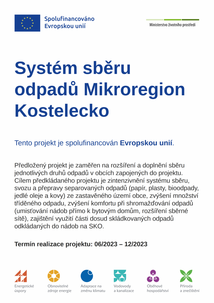 Předložený projekt je zaměřen na rozšíření a doplnění sběru jednotlivých druhů odpadů v obcích zapojených do projektu. Cílem předkládaného projektu je zintenzivnění systému sběru, svozu a přepravy separovaných odpadů (papír, plasty, bioodpady, jedlé oleje a kovy) ze zastavěného území obce, zvýšení množství tříděného odpadu, zvýšení komfortu při shromažďování odpadů (umisťování nádob přímo k bytovým domům, rozšíření sběrné sítě), zajištění využití části dosud skládkovaných odpadů odkládaných do nádob na SKO.